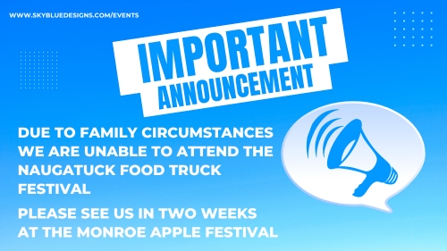 FeaturedDue to family circumstances we will be unable to attend the Naugatuck Food Truck Festival on August 24, 2024. Please join us in two weeks at the Monroe Apple Festival – Day 1 and Monroe Apple Festival - Day 2. Thank you for understanding.