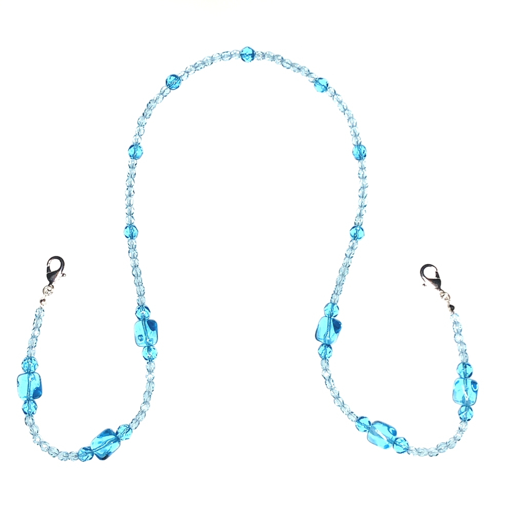 Over 200 light and medium aqua Czech glass pressed and fire polished beads connect your mask’s two elastic straps with two large lobster claw style clasps. Mask holder is strung on Soft Flex™ beading wire with silver plated findings and measures 23.5 inches.