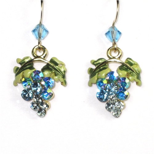 Our grape earrings are always popular at art and wine festivals and wine tasting parties. A cluster of aquamarine, light azore, and aqua AB Swarovski crystals dangles below a Swarovski crystal-wrapped gold filled or sterling silver ear wire. Earrings measure approx. 1-1/4″.