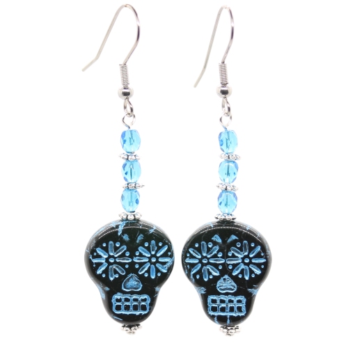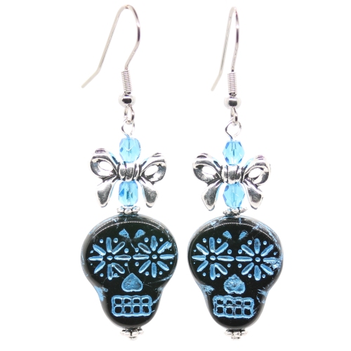 Customizable Dia de los Muertos earrings featuring black Czech glass sugar skull beads with metallic blue inlay dangle beneath your choice of beads on top. Choose from short with one bead, long with three beads, or with a silver tone, lead free pewter bow between two beads.