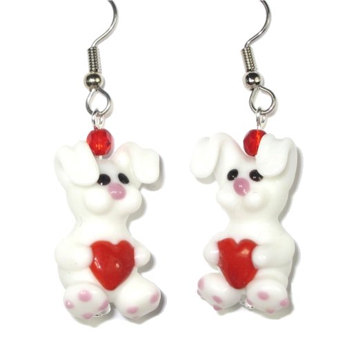 Celebrate Spring and Easter with these fun bunny rabbit lampwork earrings with floppy ears and holding a heart. Earrings measure approximately 2″ including surgical steel ear wires.