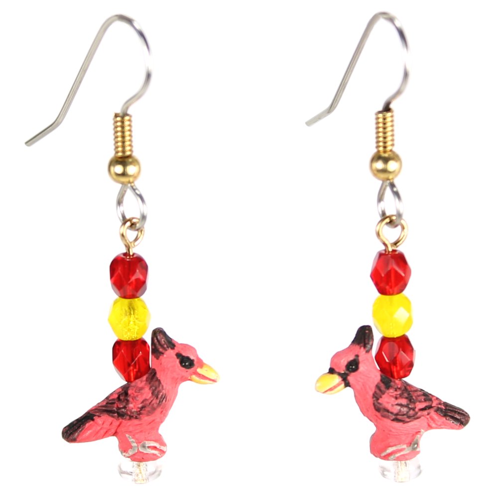 Teeny tiny Peruvian ceramic cardinal beads dangle beneath coordinating Czech glass beads. Perfect for any bird watcher, they measure approximately 2″ long, including stainless steel ear wires.