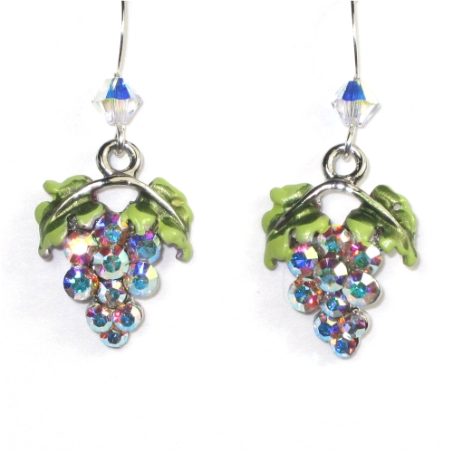 Our grape earrings are always popular at art and wine festivals and wine tasting parties. A cluster of crystal AB Swarovski crystals dangles below a Swarovski crystal-wrapped gold filled or sterling silver ear wire. Earrings measure approx. 1-1/4″.