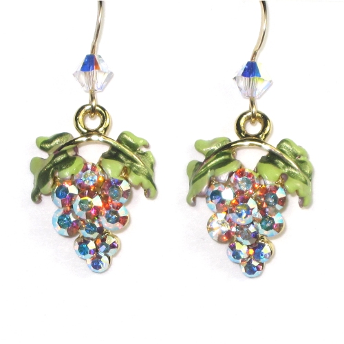 Our grape earrings are always popular at art and wine festivals and wine tasting parties. A cluster of crystal AB Swarovski crystals dangles below a crystal-wrapped gold filled or sterling silver ear wire. Earrings measure approx. 1-1/4″.