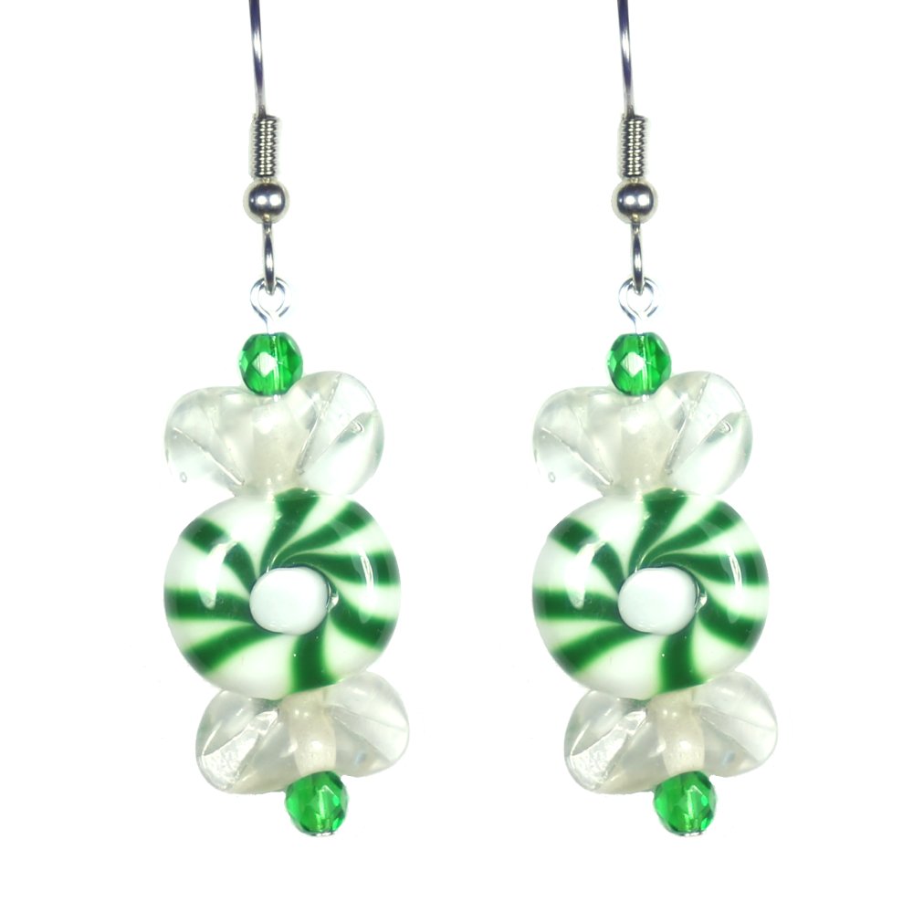 Show your holiday spirit with these sweet earrings made with green spearmint candy lampwork beads and matching green Czech glass beads. Wear them for the Christmas holiday season all the way through the New Year. Earrings measure approximately 2″ including surgical steel ear wires.