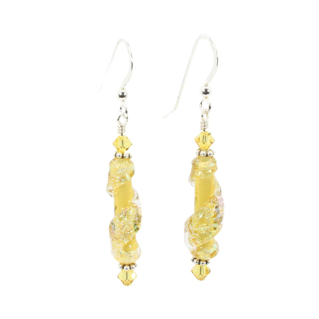 Long light topaz colored tube shaped focal beads have a spiral of sparkly dichroic glass on top. They are paired with double AB Swarovski crystals and sterling silver ear wires and findings for the highest quality earrings.
