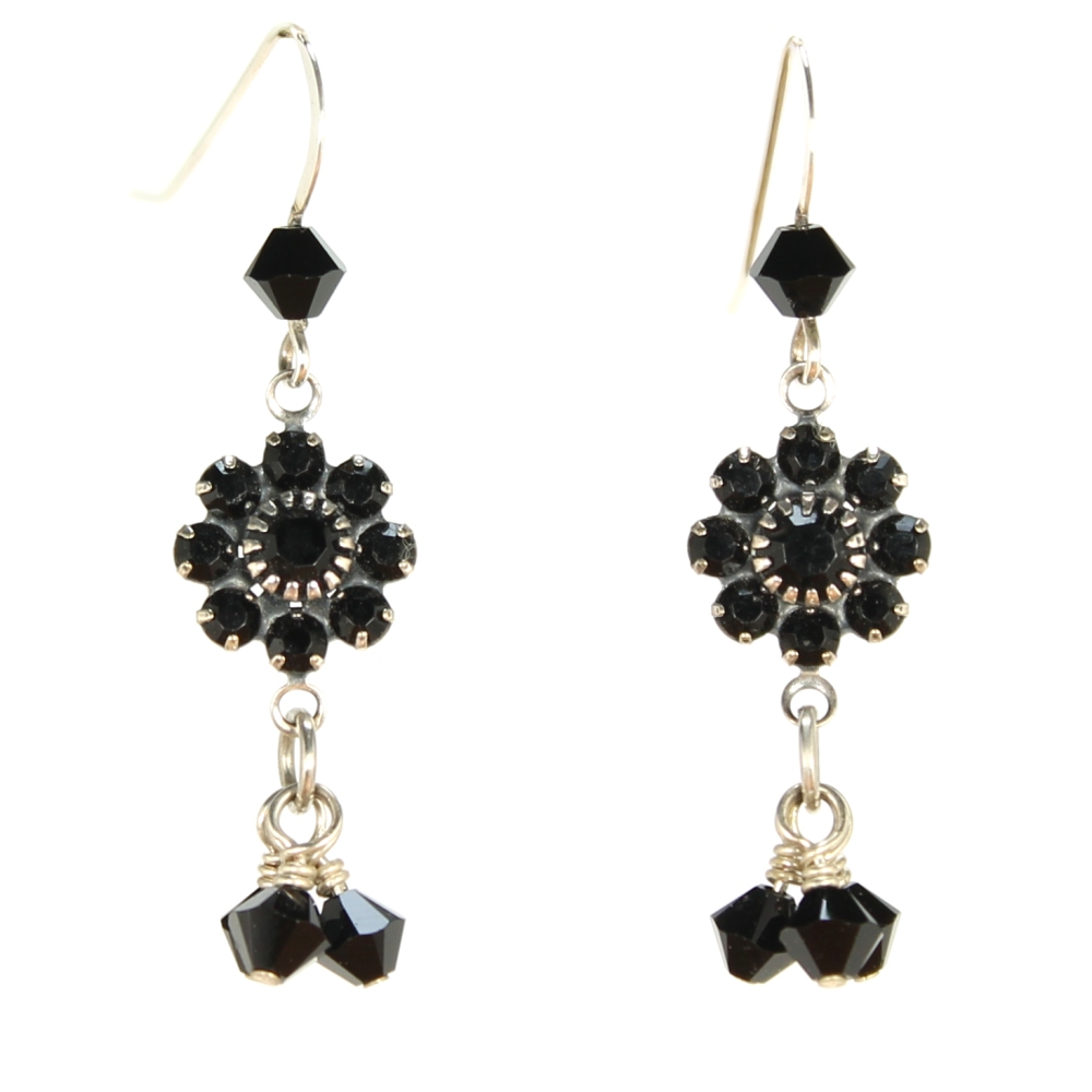 A flower component with jet (black) Swarovski® crystals sparkles beneath a single Swarovski crystal wrapped on a sterling silver ear wire. Three jet Swarovski crystals dangle beneath each flower. Earrings measure approx. 2″ including sterling silver ear wire. Components are silver plated brass.