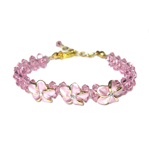 Three pink enameled plumeria charms and a Swarovski® crystal center are surrounded by 65 light rose Swarovski crystals woven on Soft Flex® beading wire. Bracelet size is 7″ with a 1-1/2″ extender chain for easy adjusting. All components are gold plated or silver/rhodium plated.