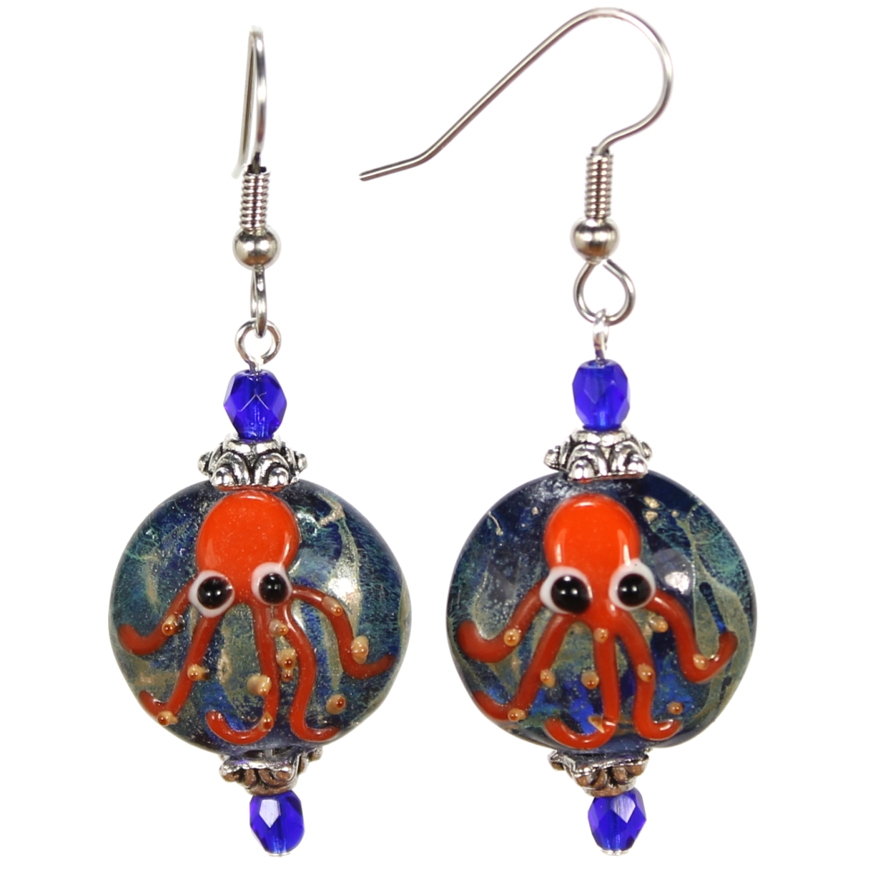 Wonderfully detailed large orange octopus lampwork beads on a cobalt background are enclosed by pewter bead caps and coordinating Czech glass fire polished beads. Perfect for the sea and ocean lover or aquarium fan. Earrings measure approximately 2″ including surgical steel ear wires.