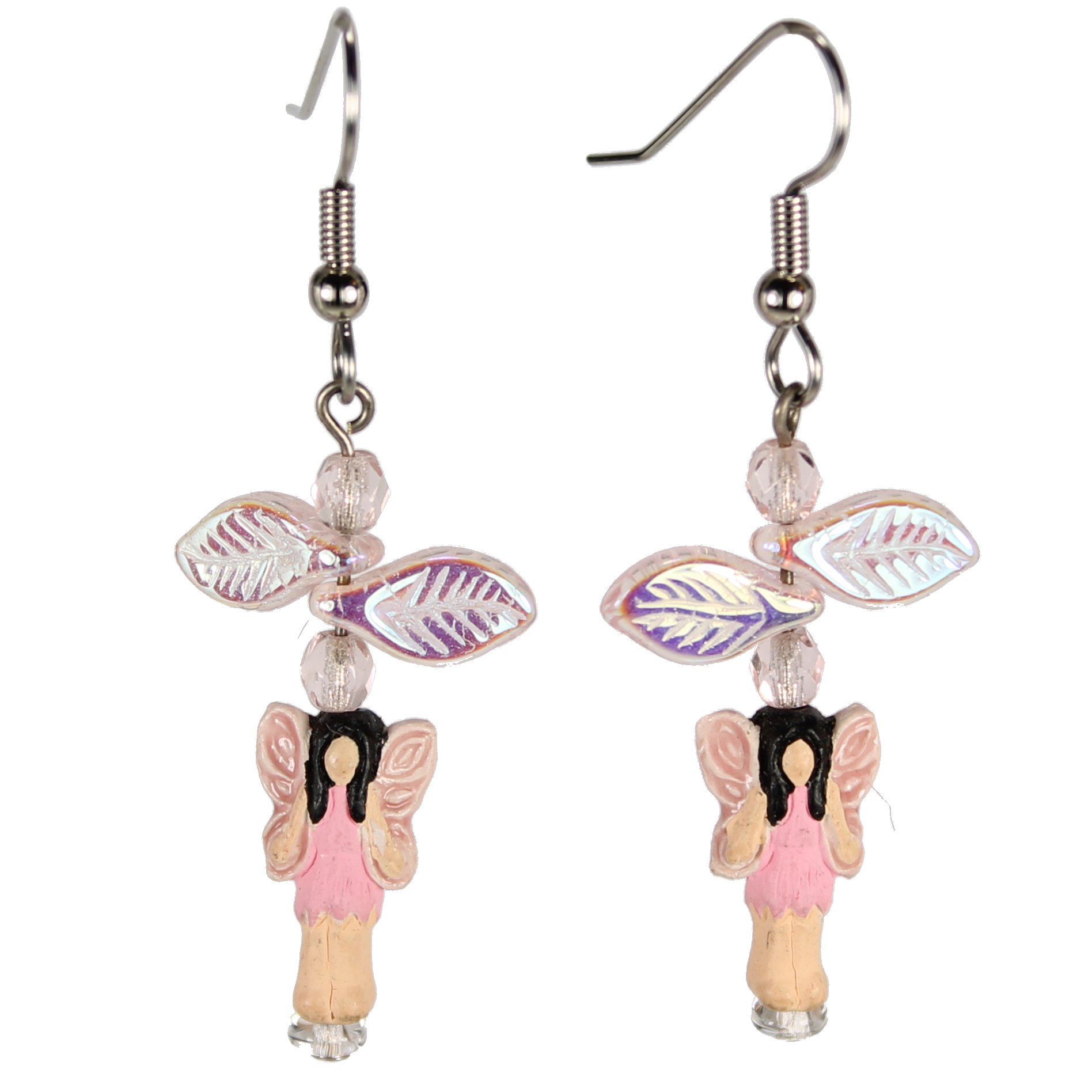 Teeny tiny Peruvian ceramic pink fairy with light skin beads dangle beneath coordinating Czech glass beads. Pink fairies with dark skin also available. These earrings measure approximately 2″ long, including stainless steel ear wires.