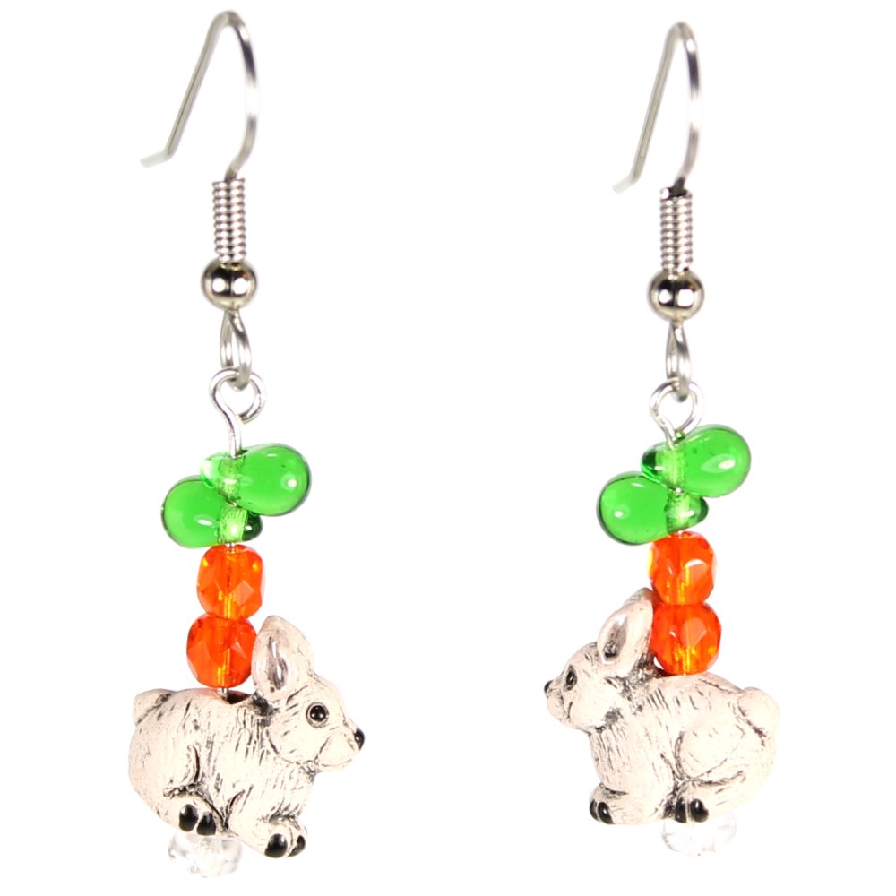 Teeny tiny Peruvian ceramic bunny rabbit beads dangle beneath a carrot of Czech glass beads. Perfect for Easter or rabbit owners, these earrings measure approximately 2″ long, including stainless steel ear wires.