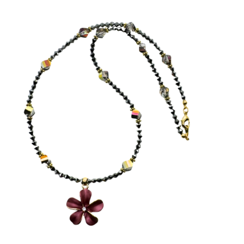 More than 100 gunmetal and crystal volcano AB Swarovski crystals and lead safe pewter spacers surround an extra large, red enameled plumeria flower with a Swarovski crystal center. Necklace measures approx. 20″. All components are gold or silver plated.