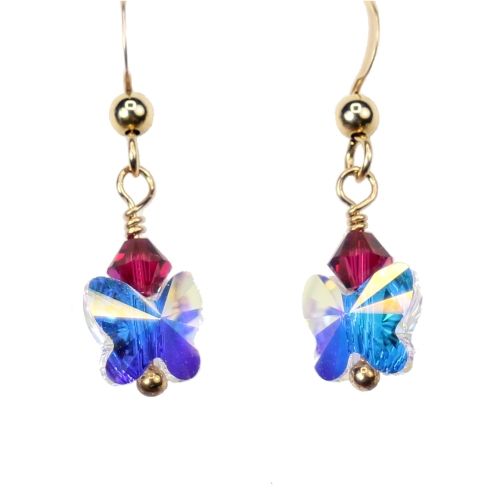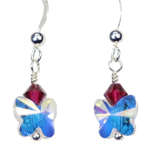 A delicate crystal AB Swarovski crystal butterfly dangles beneath a single ruby Swarovski crystal to represent the month of July. These earrings are perfect for a birthday, anniversary, or as memorial jewelry.