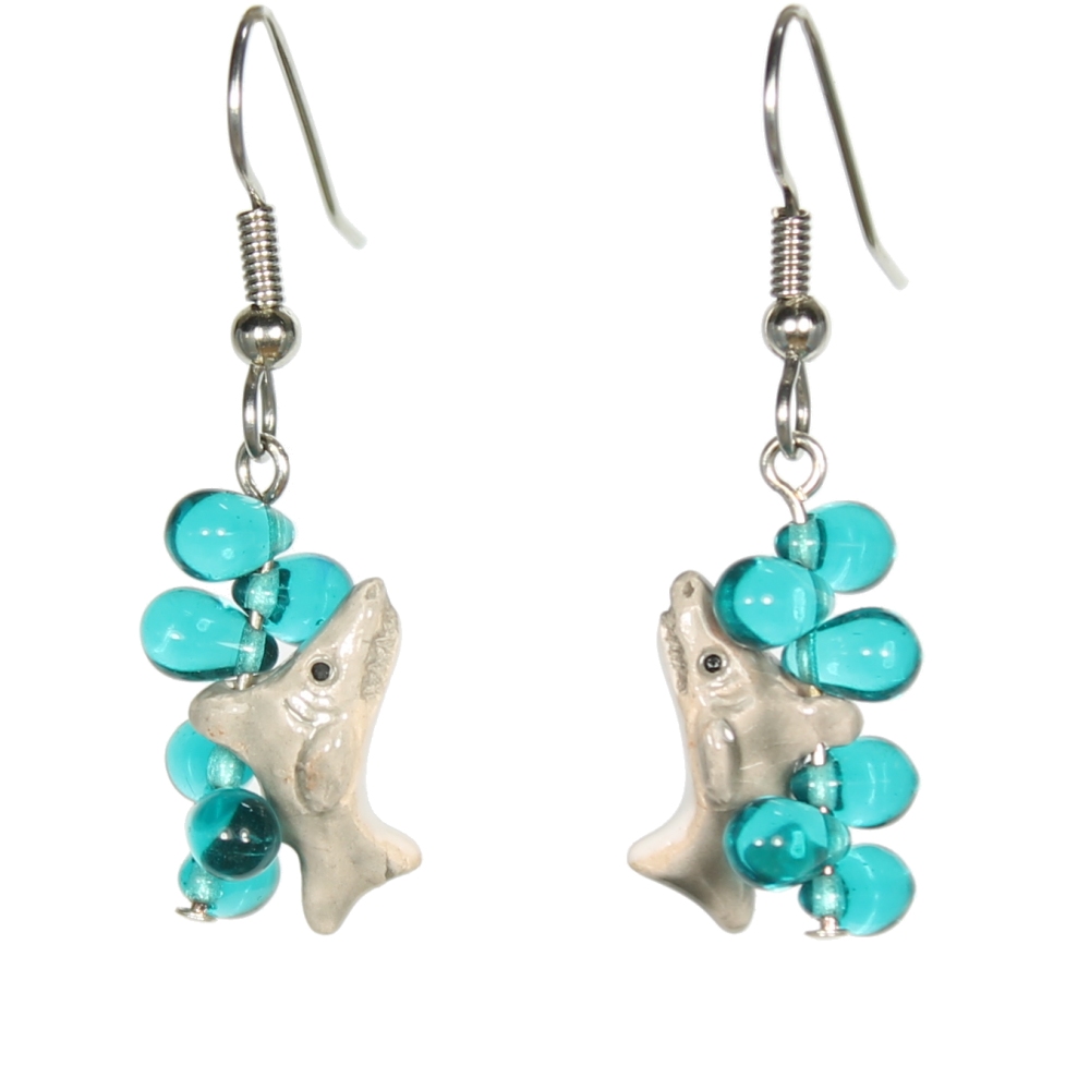 Teeny tiny Peruvian ceramic shark beads dangle between coordinating teardrop Czech glass beads. Great for a trip to the aquarium! Earrings measure approximately 2″ long, including stainless steel ear wires.