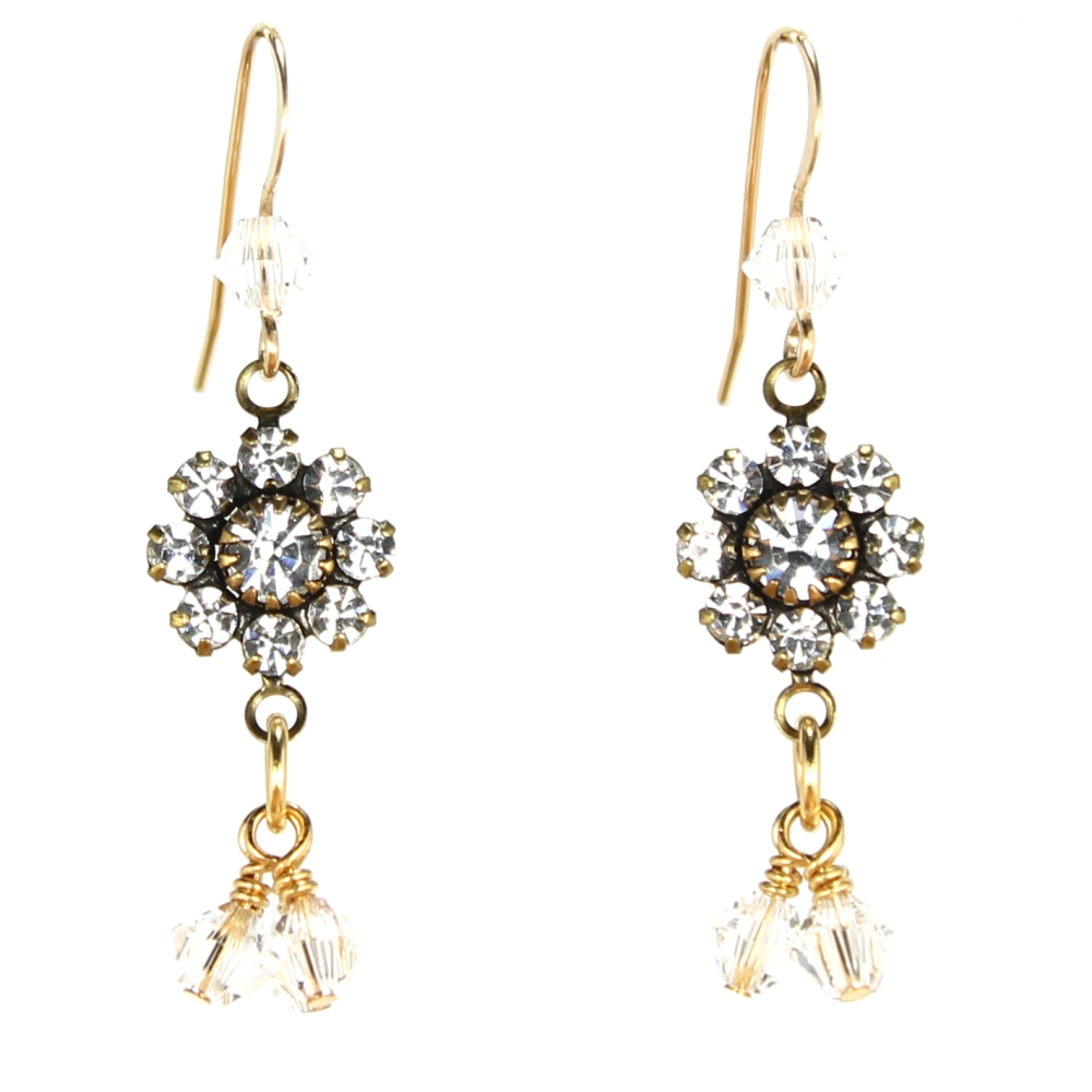 A flower component with silver shade Swarovski® crystals sparkles beneath a single Swarovski crystal wrapped on a gold filled ear wire. Three silver shade Swarovski crystals dangle beneath each flower. Earrings measure approx. 2″ including gold filled ear wire. Components are brass, and headpins and jump rings are gold plated brass.