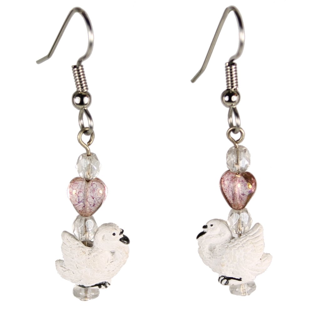 Teeny tiny Peruvian ceramic swan beads dangle beneath coordinating Czech glass beads. Perfect for any bird lover, they measure approximately 2″ long, including stainless steel ear wires.
