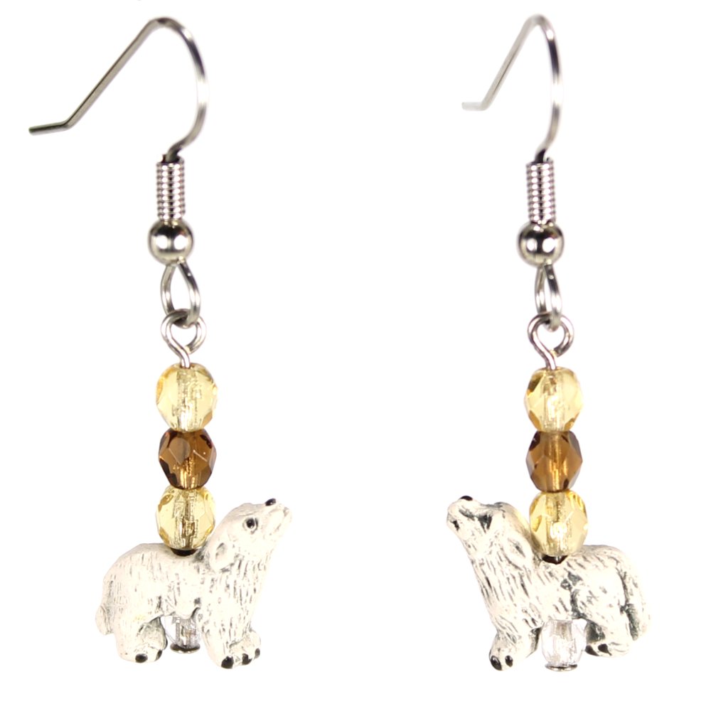 Teeny tiny Peruvian ceramic wolf or coyote beads dangle beneath coordinating Czech glass beads. Fans of woodland creatures will love these earrings, which measure approximately 2″ long, including stainless steel ear wires.